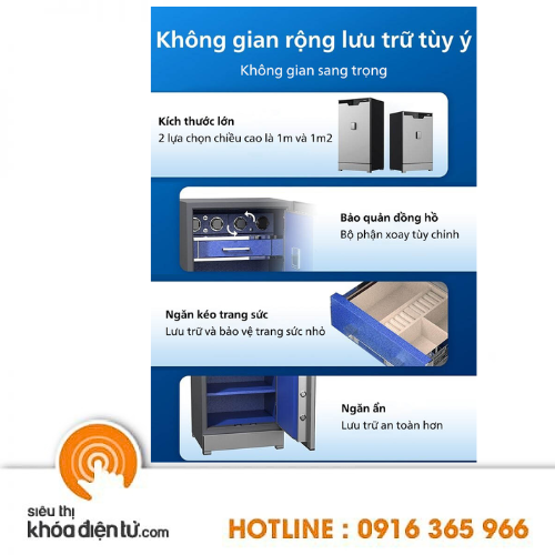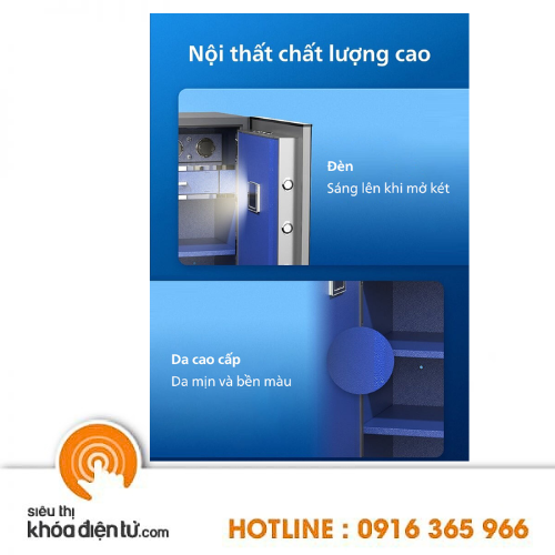 Toàn bộ nội thất két sắt được bọc da PU cao cấp, hoàn thiện đến từng chi tiết đem đến sự hoàn hảo cho két sắt. Ngoài ra, két còn trang bị thêm ngăn kéo bí mật giúp lưu trữ và bảo quản các món đồ trang sức giá trị.