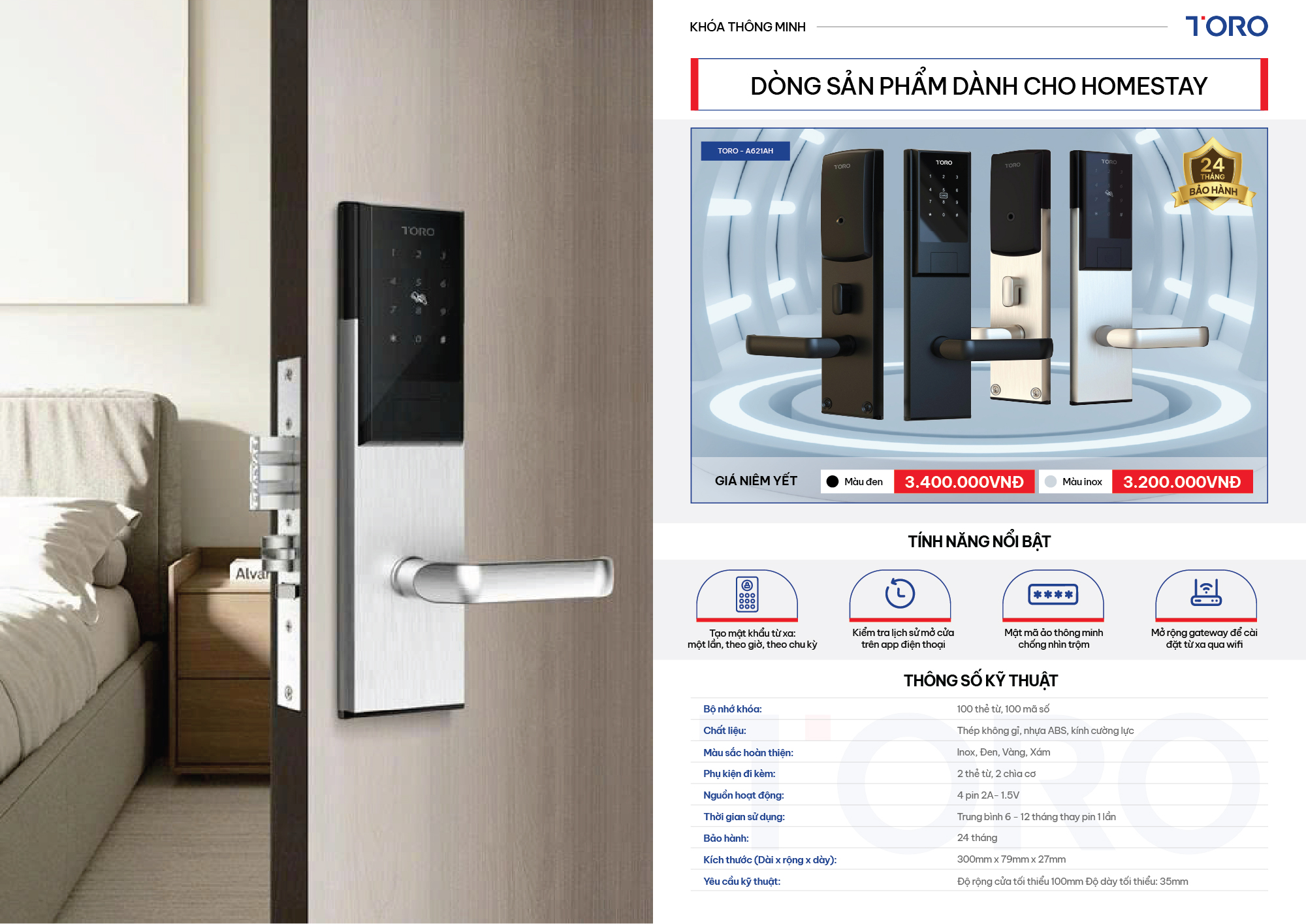 TORO C1 là một trong những mẫu khóa cửa thông minh nổi tiếng trong lĩnh vực điện tử. Với thiết kế hiện đại, đầy đủ tính năng cùng mức giá hợp lý. Khóa cửa TORO C1 tích hợp những công nghệ hiện đại nhất hiện nay như: thẻ từ chống sao chép, mã số ảo... nâng cao bảo mật cho căn nhà của bạn. Không chỉ thế, TORO C1 còn kết nối wifi giúp bạn quản lý nhà cửa mọi lúc mọi nơi.